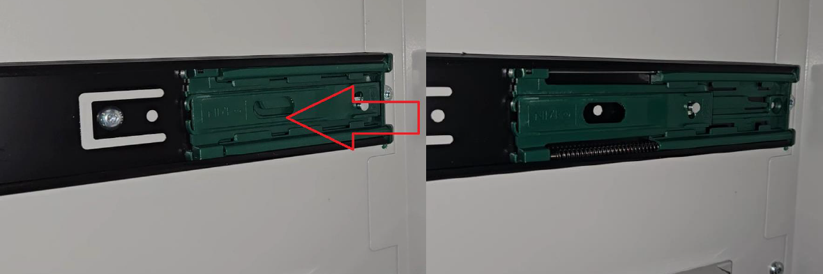 With the drawer removed the soft close latch can be seen. You need to slide the green part forward until it latches and stops as below.